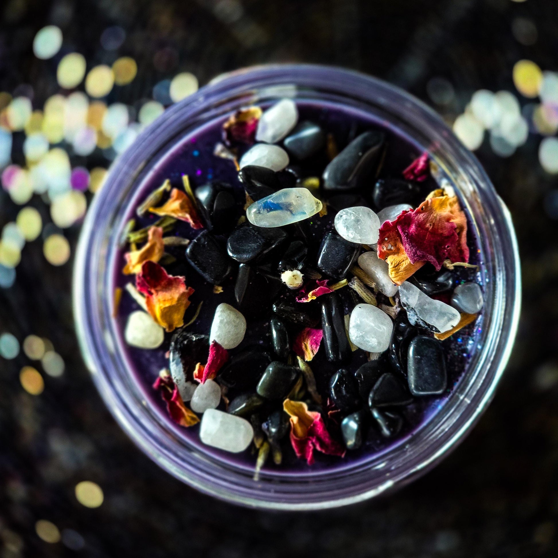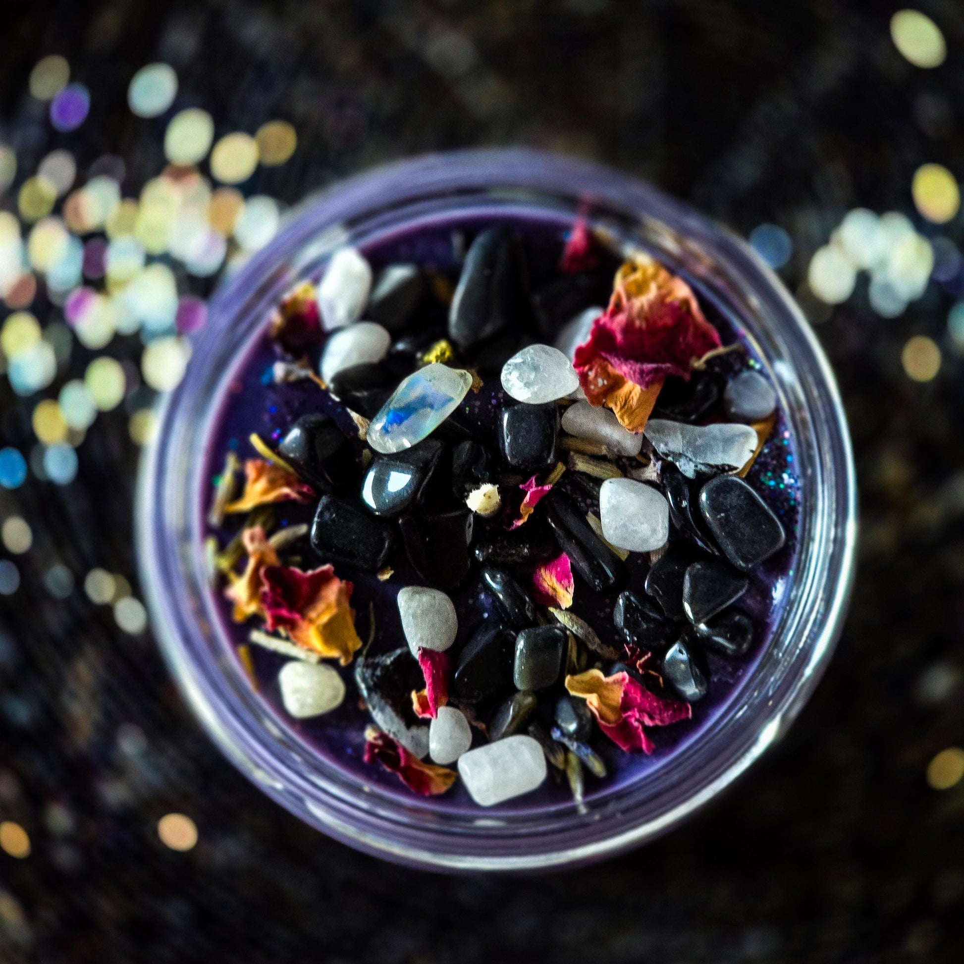 Step into your power with Dark Goddess, a candle crafted to honor the mysteries within. Topped with obsidian, moonstone, witchgrass, roses, lavender, rosemary, heather, and damiana, this candle embodies the sacred balance between shadow and light. Each element was chosen to awaken intuition, foster deep healing, and help you embrace every facet of your divine feminine energy.