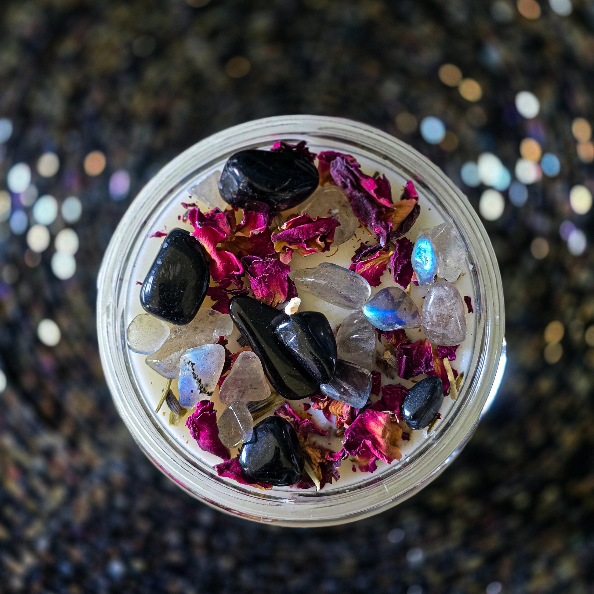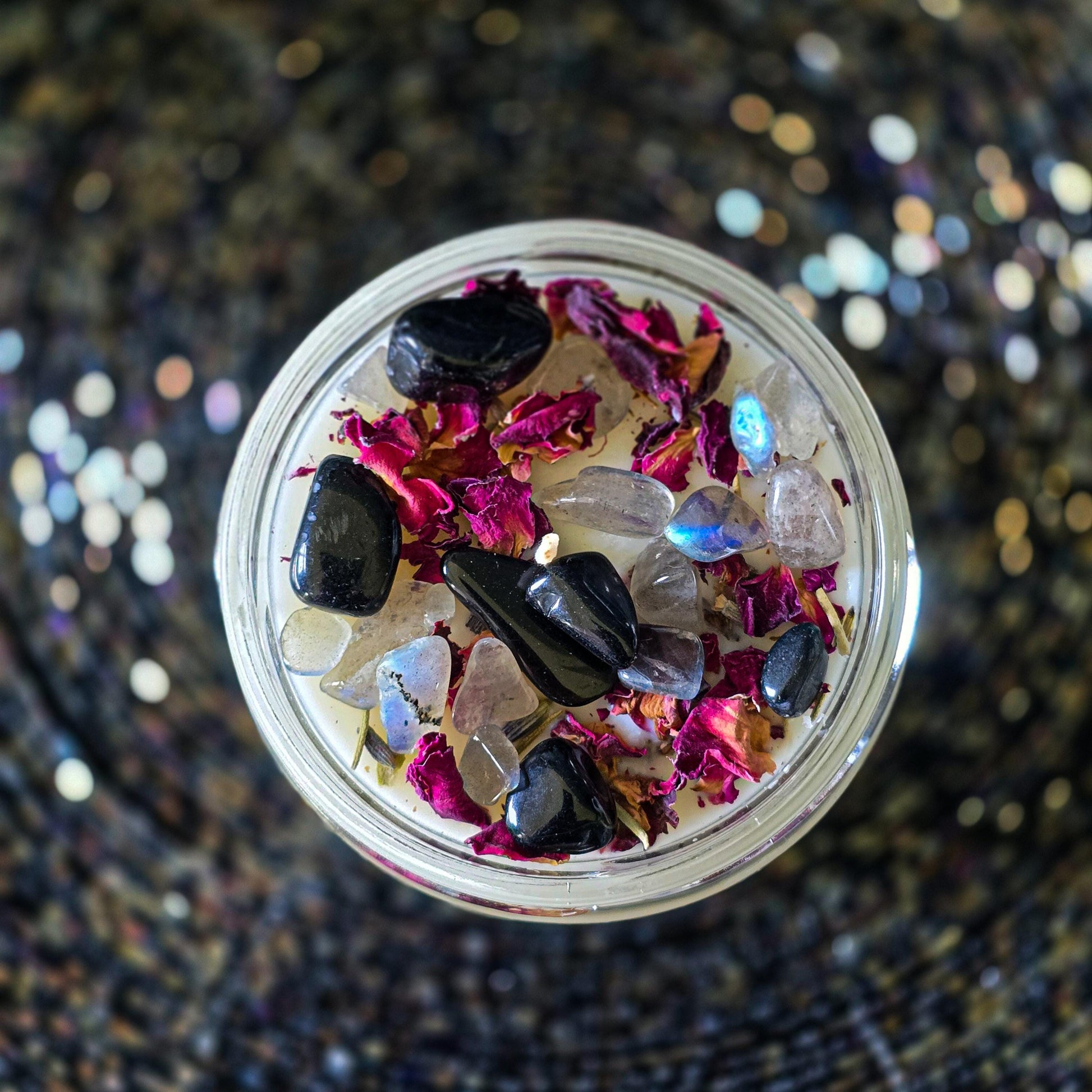 ๐ Topped with obsidian and labradorite, this candle anchors you in strength and intuition. Obsidian is a powerful stone of psychic protection, cutting through illusions and absorbing toxic energies, while labradorite acts as a shimmering veil of light, enhancing your spiritual awareness and shielding your aura.