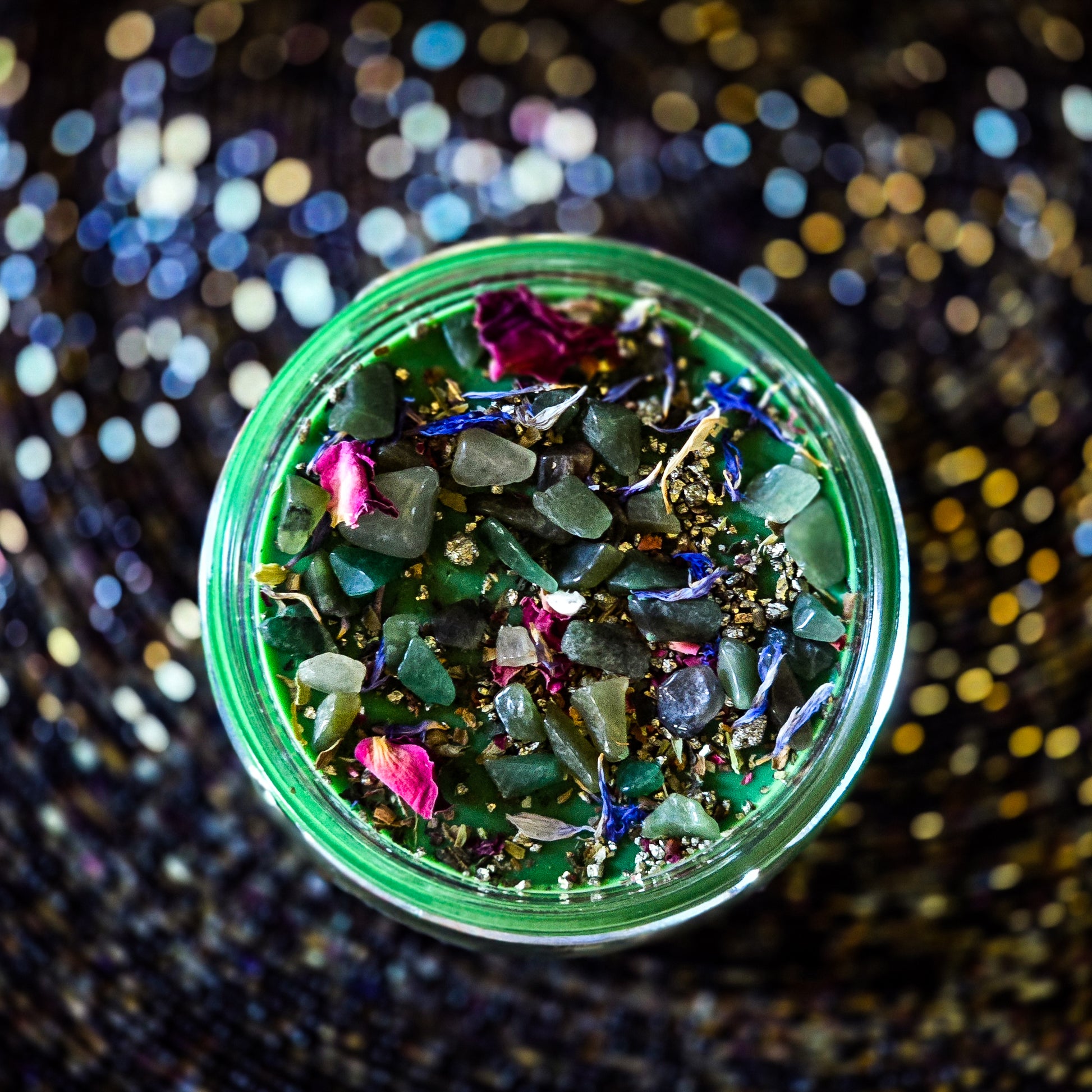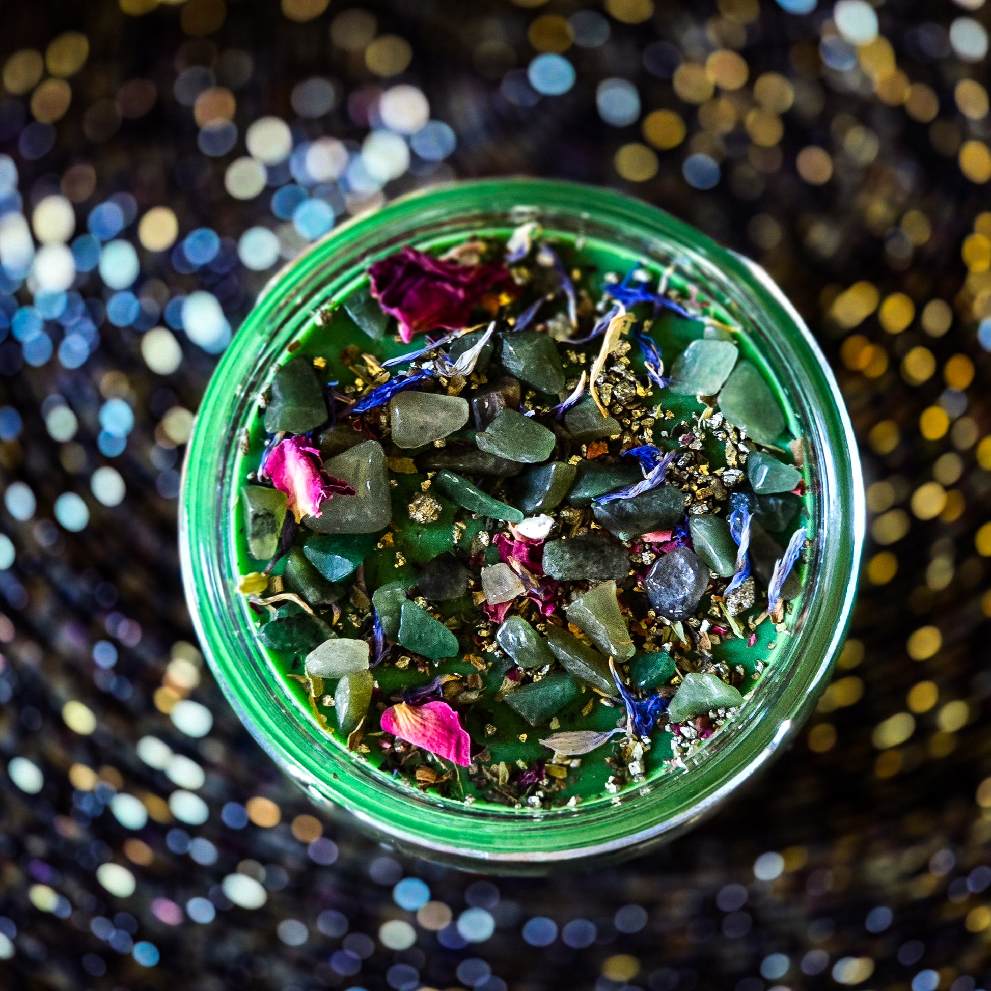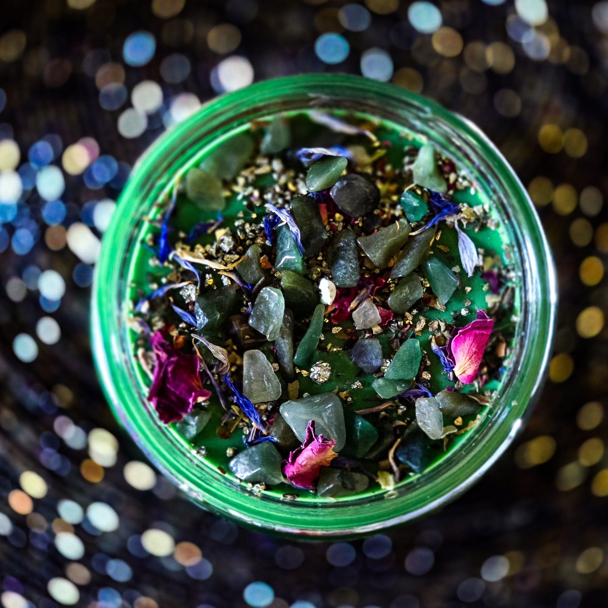 💚 Invite abundance and prosperity into your life with our Money Drawing candle. Topped with pyrite and aventurine, this candle is enriched with blue cornflower, jasmine, roses, and basil—all chosen to attract wealth and good fortune.