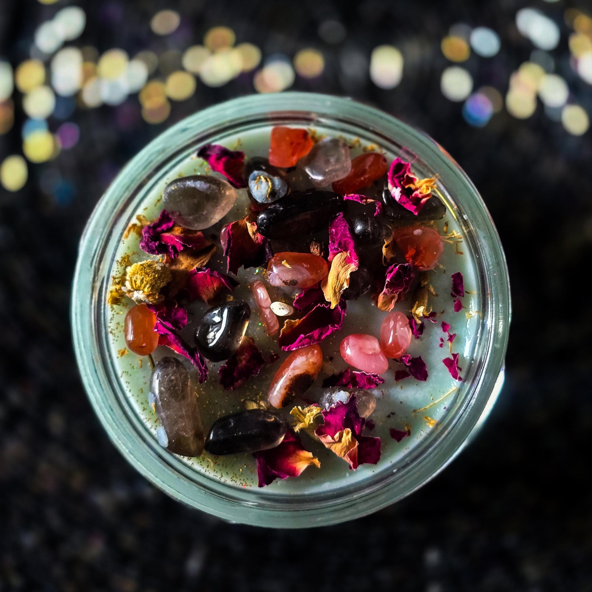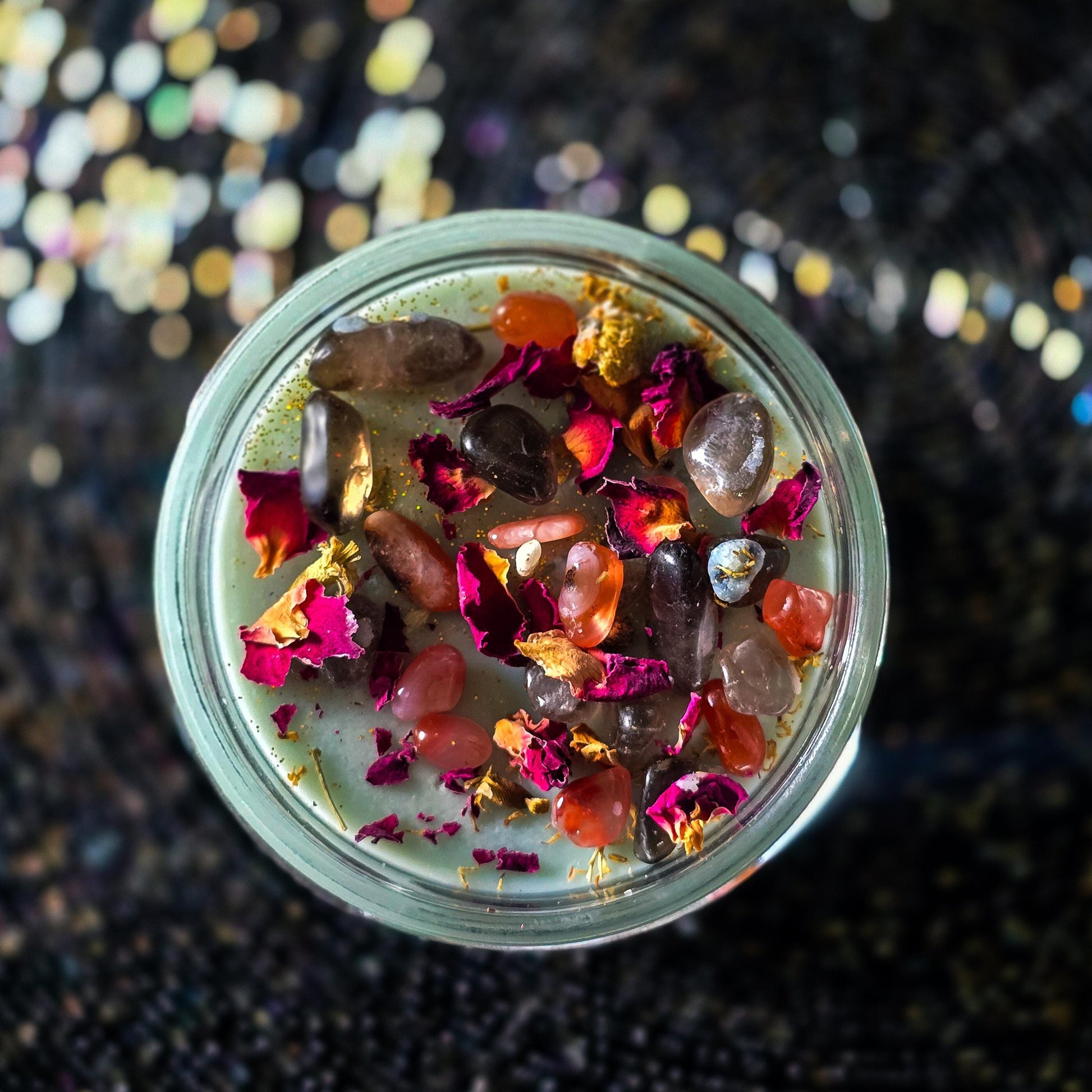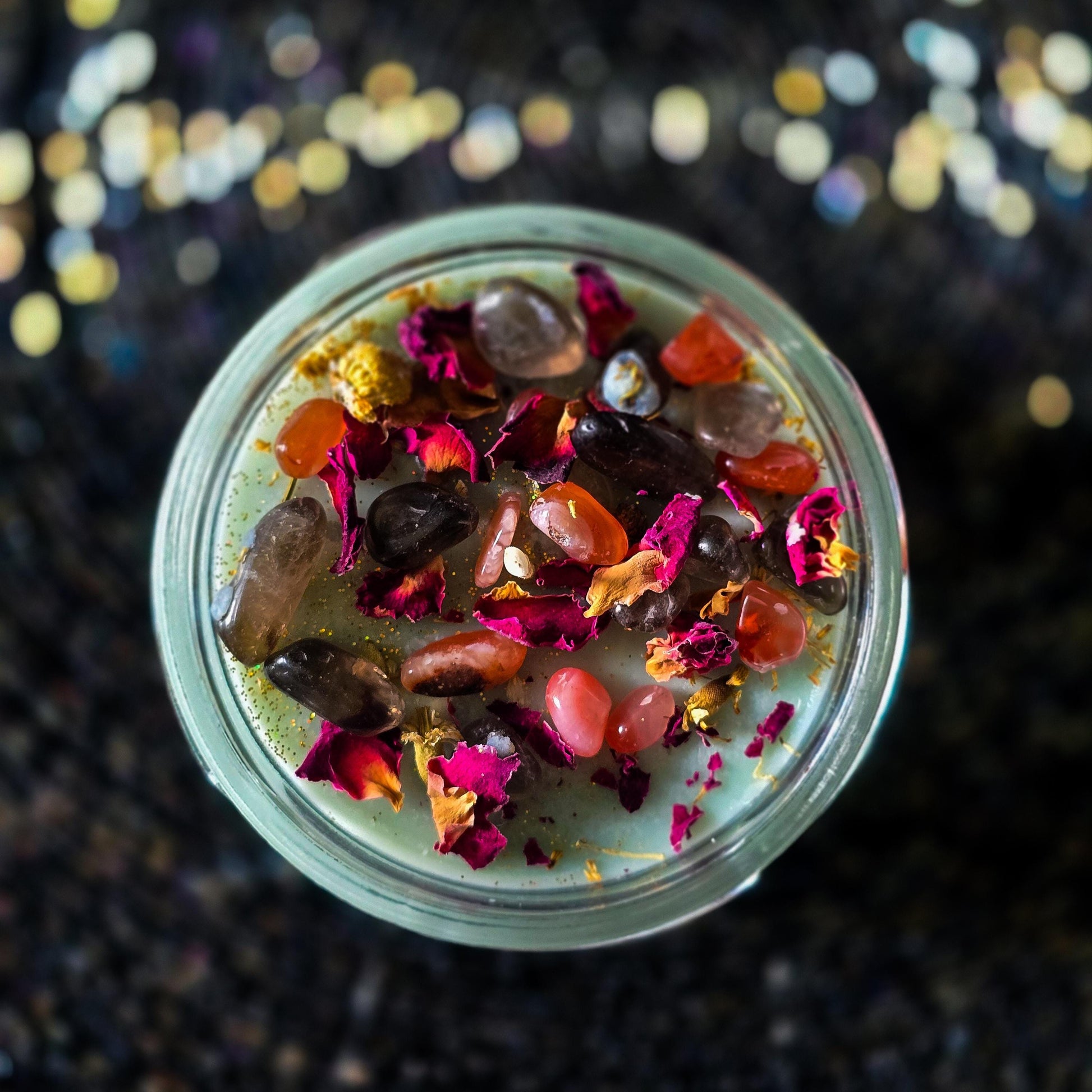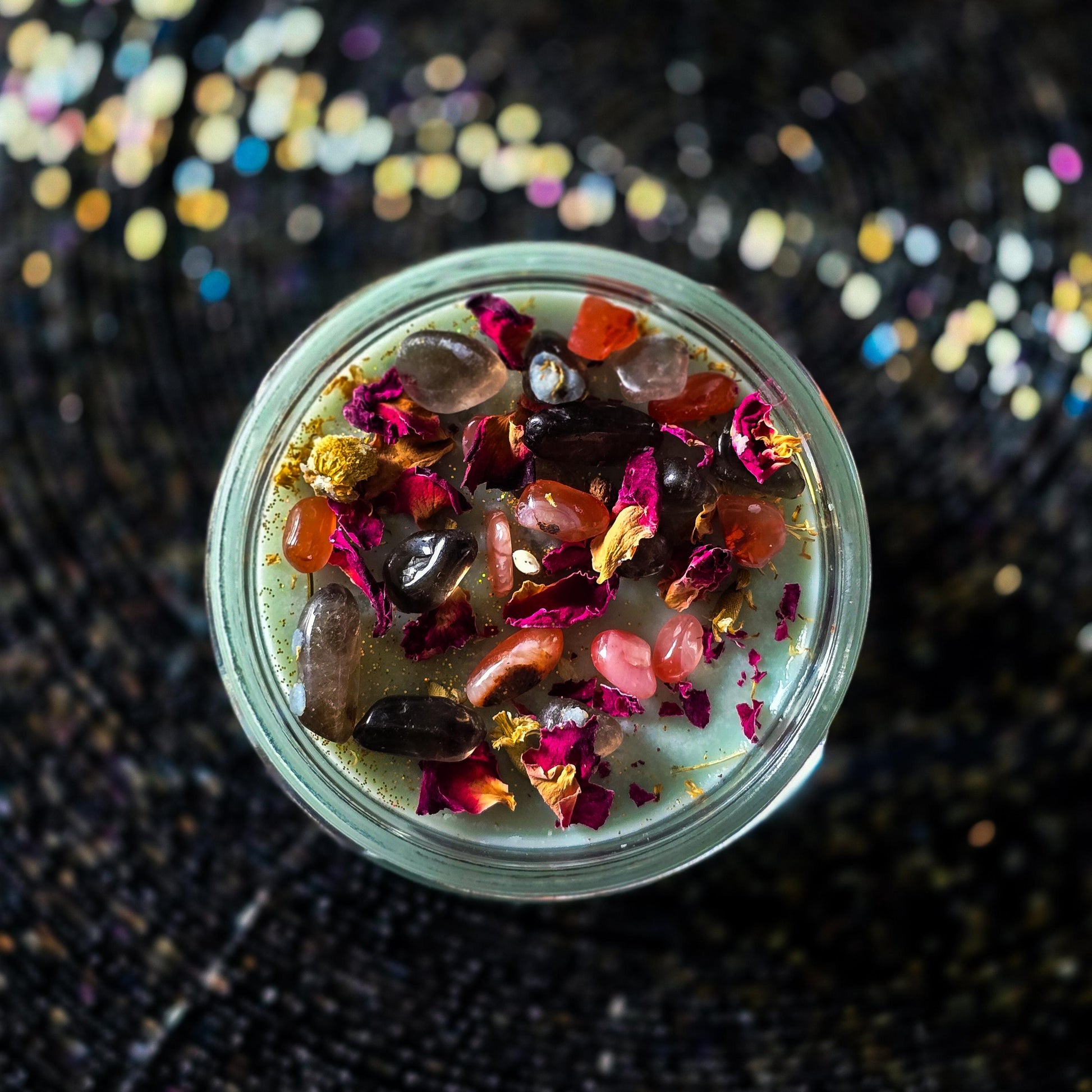 Each candle is adorned with a traditional blend of red carnelian and smoky quartz for joy, vitality, grounding, and protection, along with chamomile, roses, rosemary, bayberry, and yarrow—a winter folklore mix used throughout history to bless the home, invite good luck for the year ahead, strengthen emotional resilience, and keep the hearth spiritually warm during the darker months. Together, these botanicals weave a comforting, ancestral magic that feels both familiar and ancient, like a cherished ritual passed down through generations.