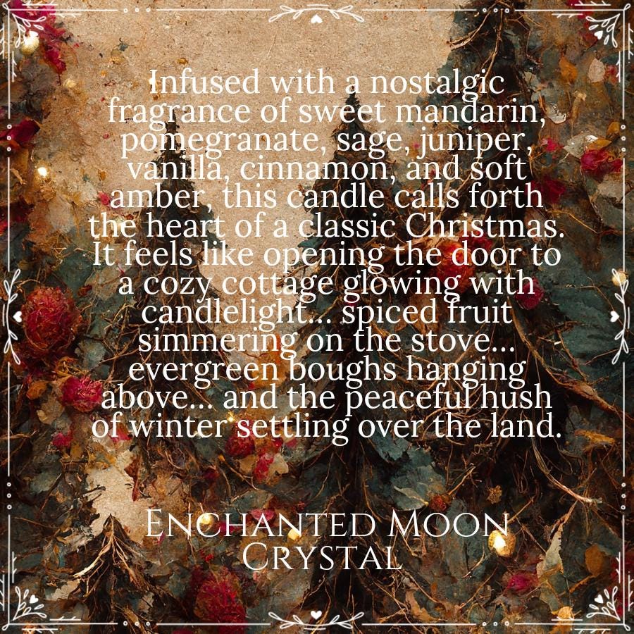 Infused with a nostalgic fragrance of sweet mandarin, pomegranate, sage, juniper, vanilla, cinnamon, and soft amber, this candle calls forth the heart of a classic Christmas. It feels like opening the door to a cozy cottage glowing with candlelight… spiced fruit simmering on the stove… evergreen boughs hanging above… and the peaceful hush of winter settling over the land.