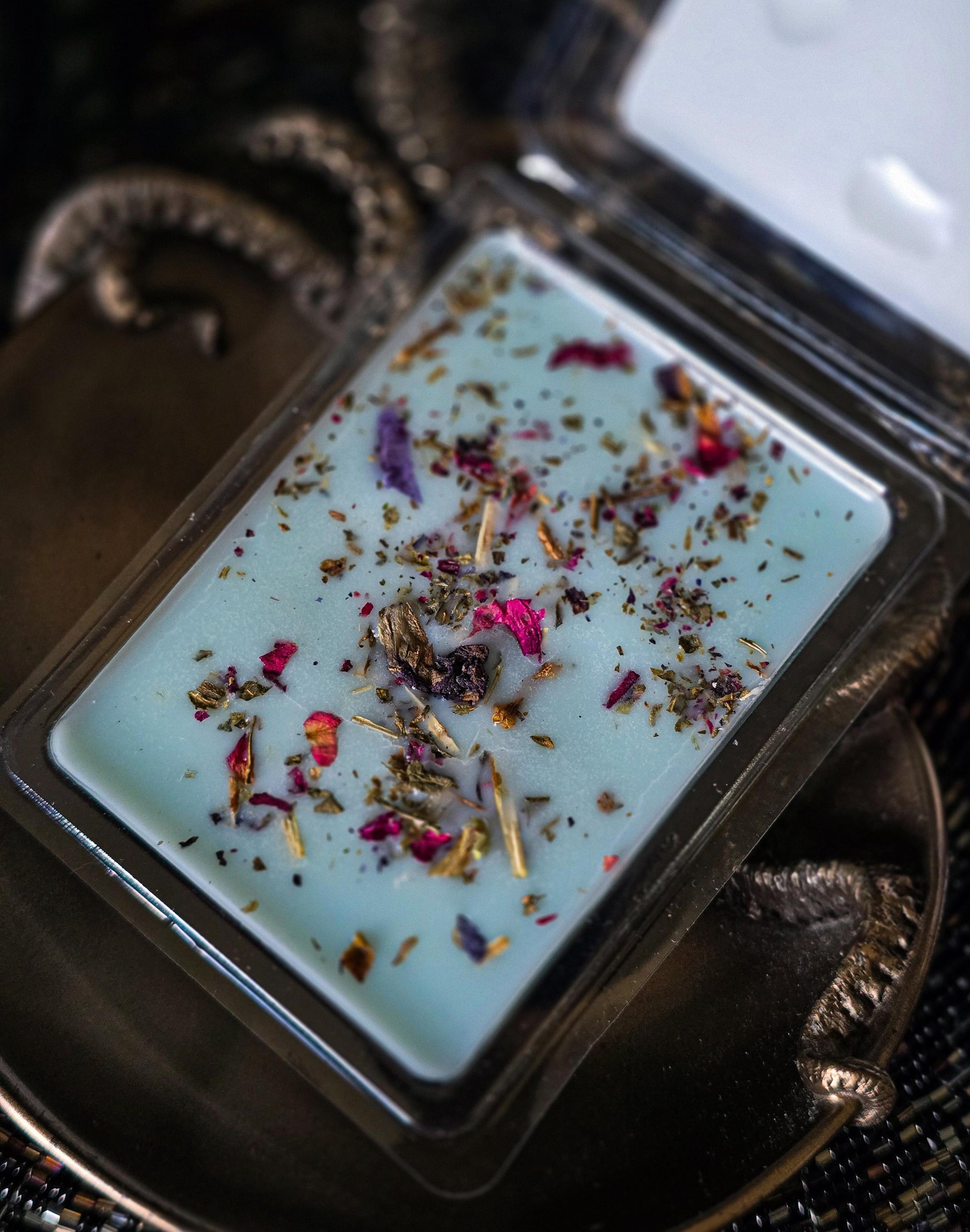 Topped with a powerful blend of hyssop, rue, butterfly pea, and roses, these melts bring together ancient cleansing herbs, gentle protection, and heart-centered harmony. As they warm, they release a scent both bright and comforting:
