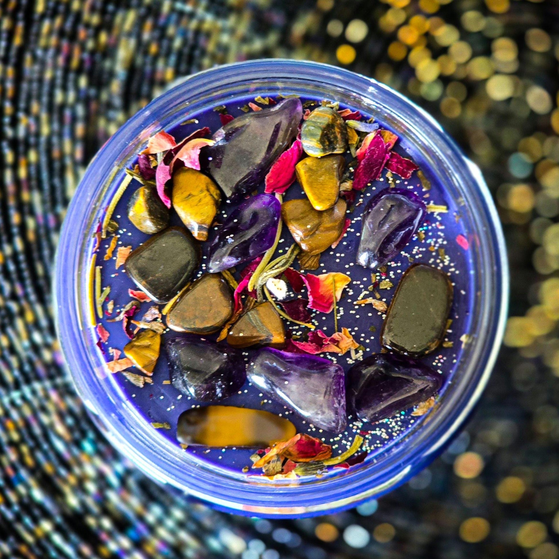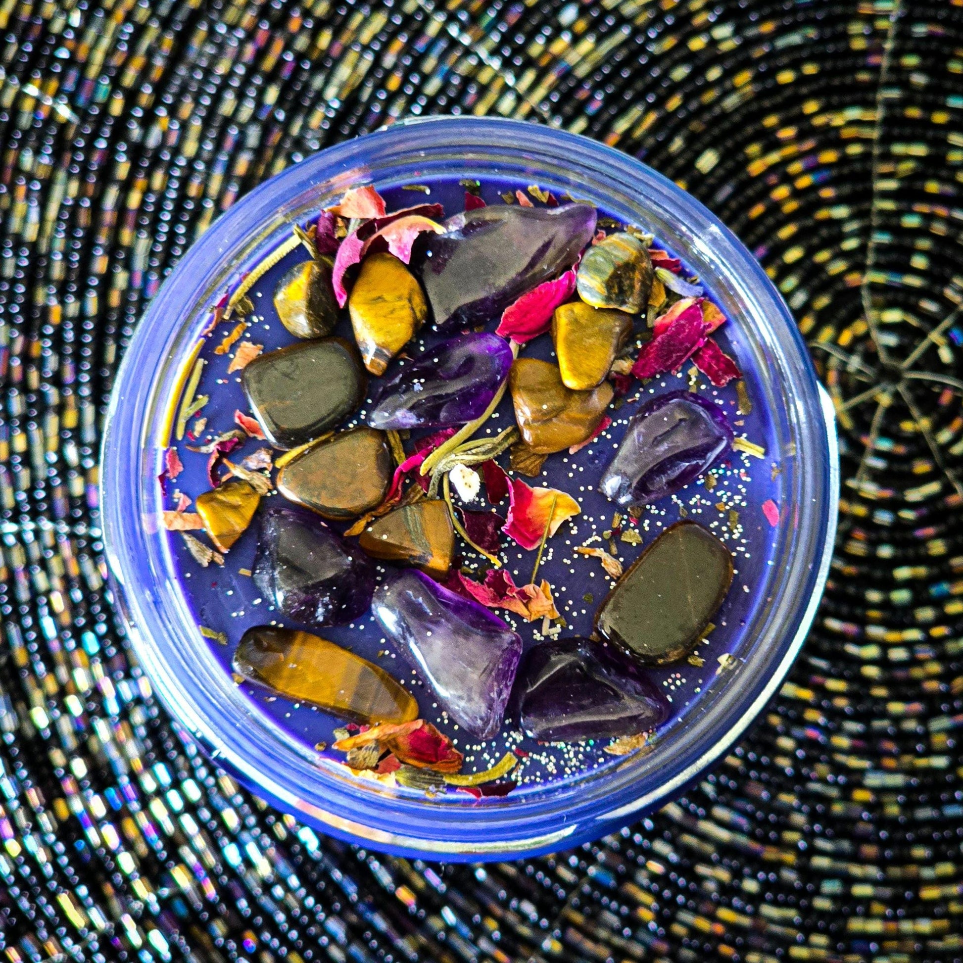 ๐ Topped with amethyst and tiger's eye, this candle brings spiritual insight, protection, and the courage to evolve. The blend of roses, spearmint, rosemary, basil, and lavender creates a refreshing aura of clarity and renewal.