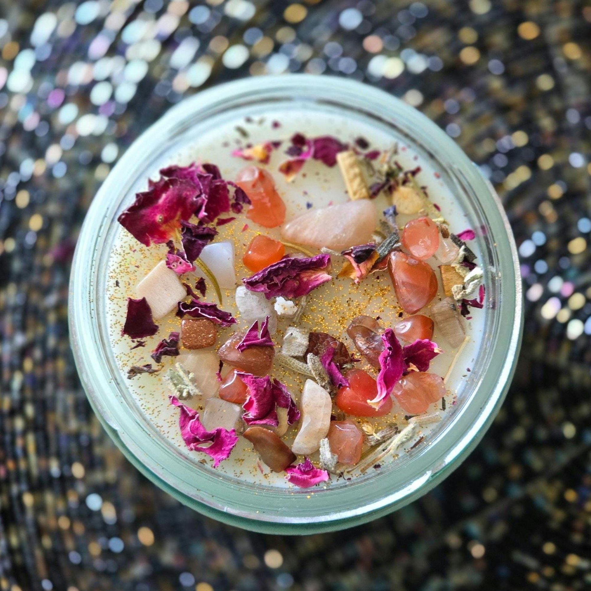 💚 These powerful botanicals and crystals are chosen to awaken your willpower, enhance clarity, and support ritual magic. Carnelian and sunstone ignite personal power and creative flow. Lavender, rosemary, and wormwood open your mind and psychic vision. Yarrow and sage protect the space as you work.